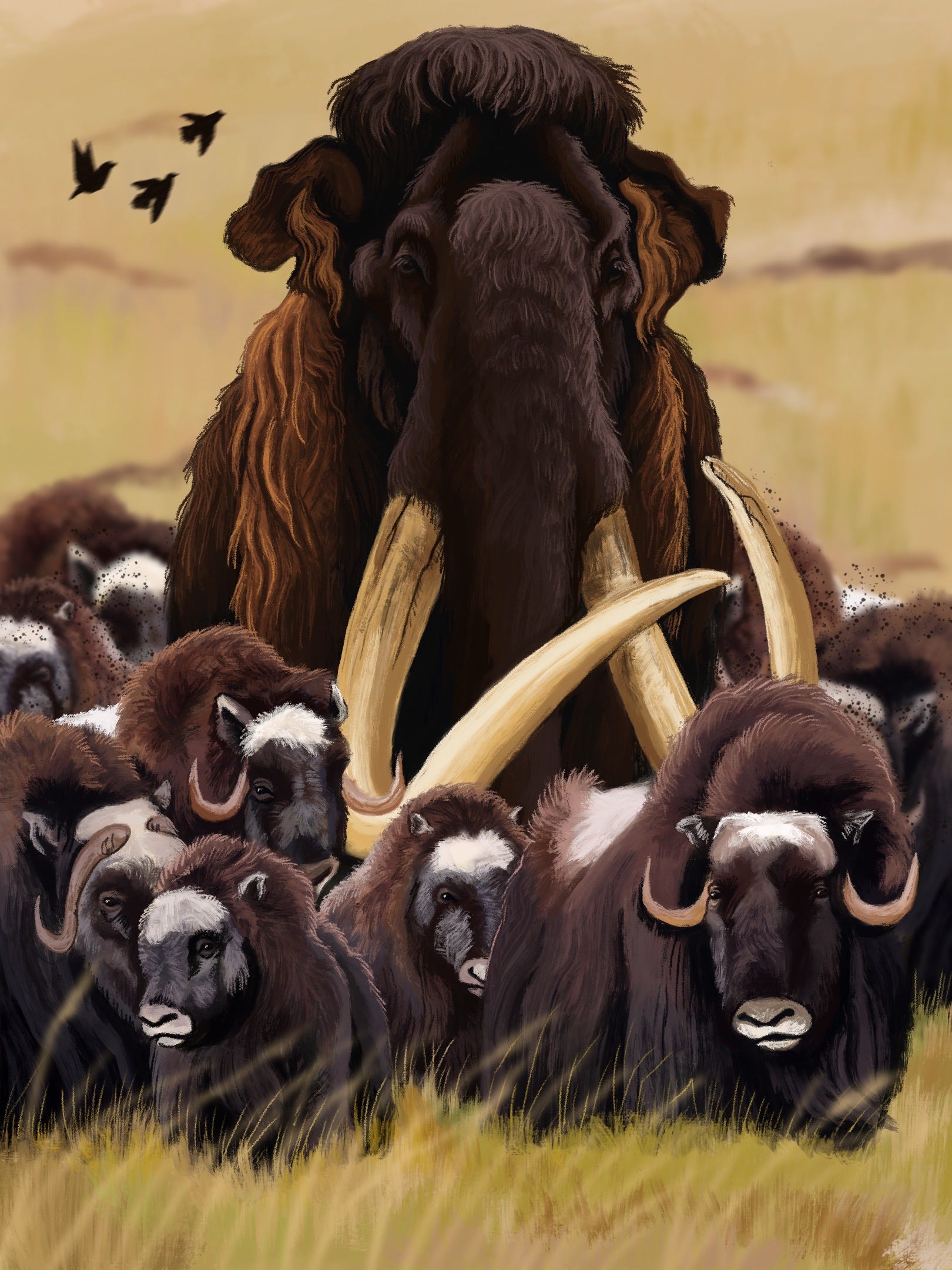 He would have been in the prime of his life if there were any others of his kind remaining on the tundra island but his only companions were the muskoxen. Dwarf brethren, trunkless, their tusks atop their heads instead of aside their mouths, bellowing to each other in a tongue he did not understand. Sometimes he rumbled or trumpeted in reply. Beseeching them for an answer, one he could hear not through his ears or the pads of his feet, but hear with his heart. His plea unanswered, always. But he would rather march with them than be alone.