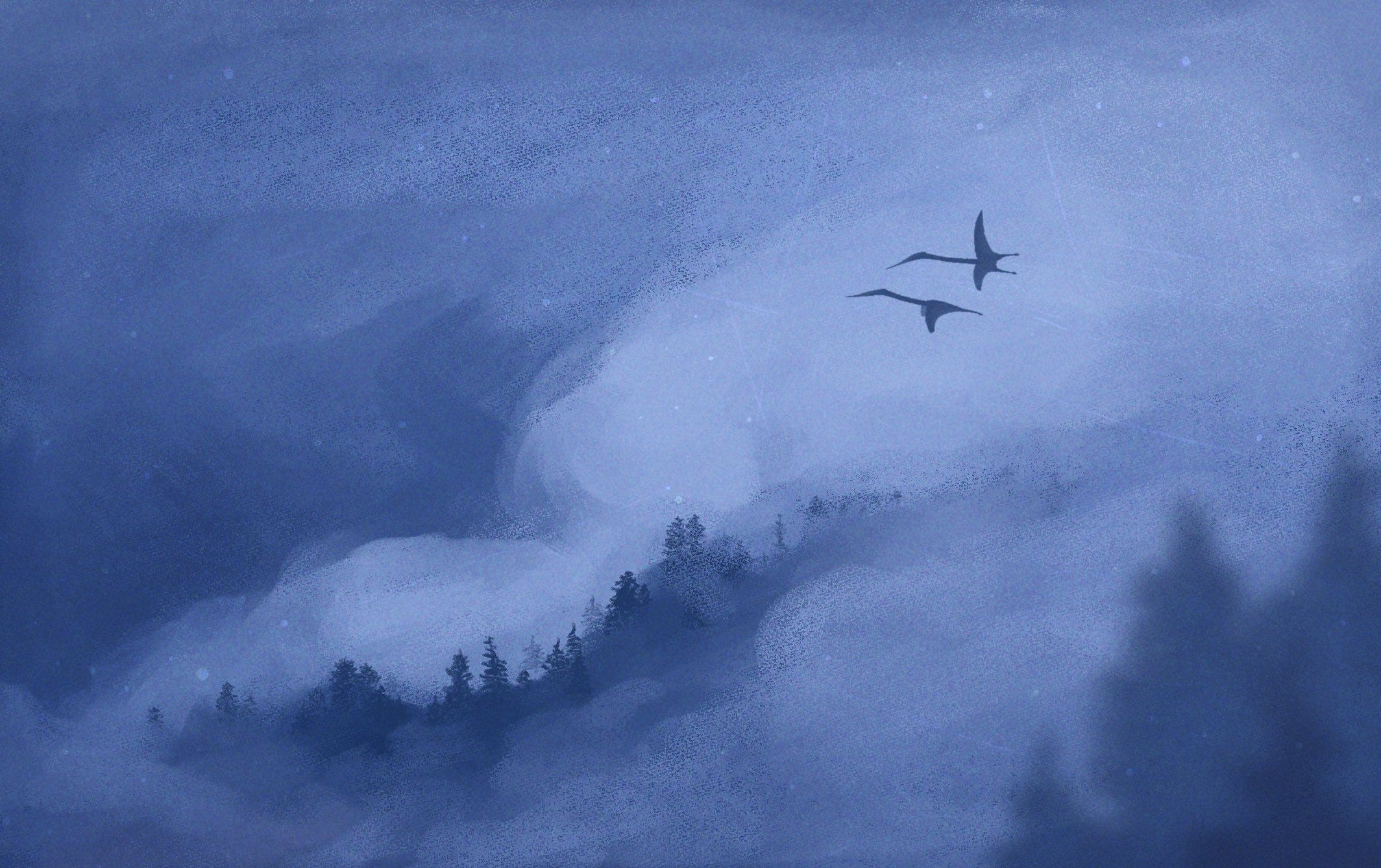 The pair of azhdarchids wing silently through the blue predawn, over the dense forests of southern Laurentia. The last of the stars linger as pale needlepoints, but the pterosaurs ignore them. They have served their navigational purpose, and now the pterosaurs rely on their own visual memory of the mountains to guide them to their winter haven in the southern part of the range. Tall and fog-wreathed, the lower ridges are limned by regiments of conifers that loom dark blue in the wan morning. One peak seemingly indistinguishable from any other, but the arcane minds of the azhdarchs can tell each stone apart as clearly as faces.