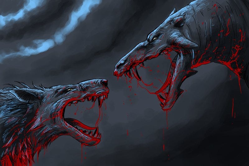 The moon glowed indistinctly behind a veil of fog, its ghostly pallor filtering down through the brume to illuminate the two combatants. In the left corner, one Hyaenodon brevirostrus, weighing one-hundred-and-one pounds. His thick, brindled fur was drenched in the blood of the young chalicothere he had just slain.