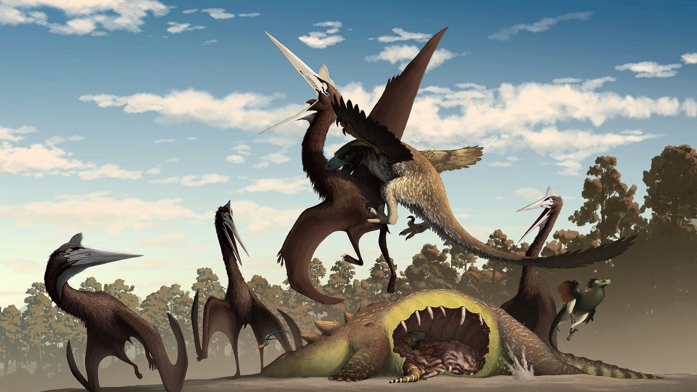 One moment, a jolly riverbank feast. A flap of four azhdarchid brothers tucked merrily into a finely-aged Nodosaurus carcass they had spotted from three miles and five-thousand feet of altitude away. They were uniformly brown of wing and hide, brown as lakemud save for their steel grey bills and casques, and the deep gular pouches they used to store leftovers.