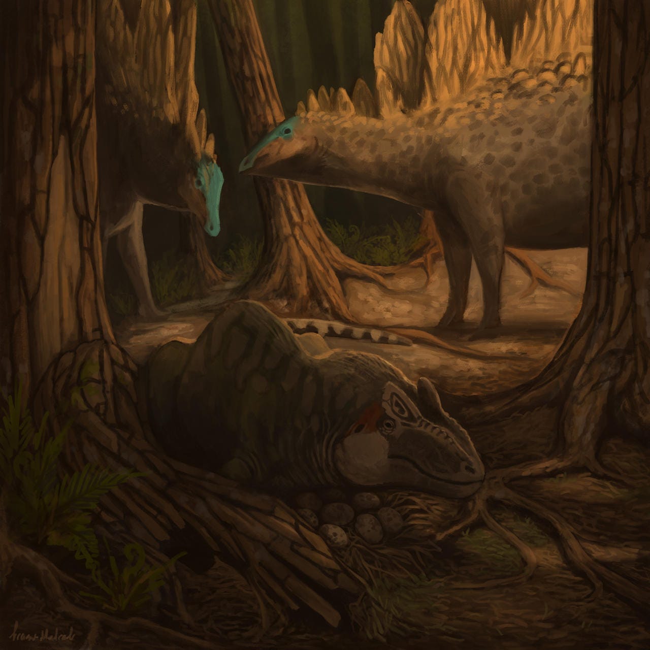 The two stegosaur males stared each other down, each with a thousand flames in his eyes. Their heads were flushed the bright turquoise of the breeding season, a sharp contrast to the playa-brown plates that rose like craggy mountain ranges from their backs. This patch of dry Morrison woods had been serenaded by both of their territorial love-songs for the past week and a half, but neither male had actually encountered the other until now.
