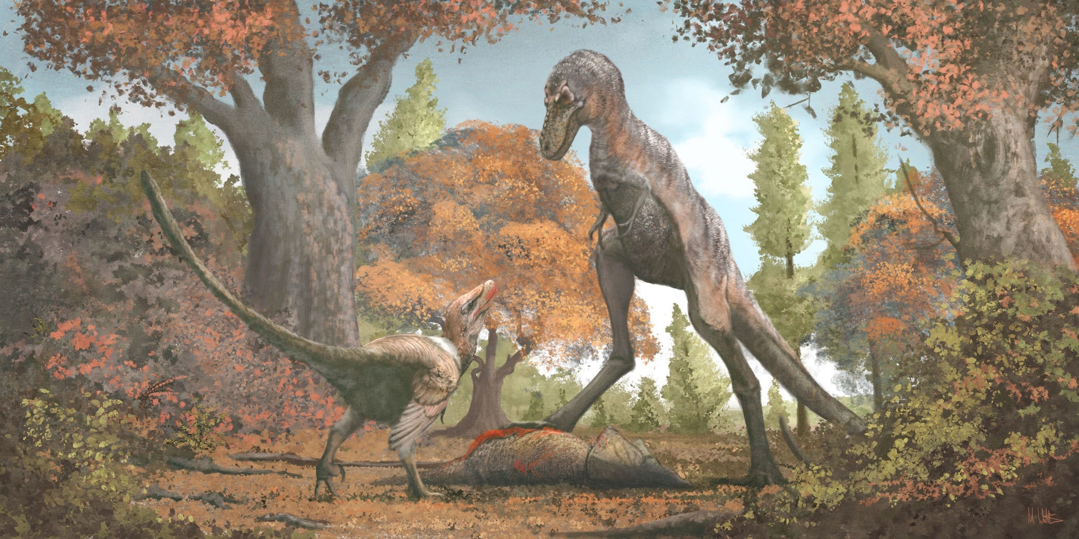She looked up from the foot, up a long, spindly leg, up the fuzzy, muscular torso, and met the eyes of the prince. Tyrannosaurus rex. Her junior by ten years, the young tyrant nevertheless towered over her and already weighed close to two-hundred pounds. Its foot stood possessively atop her kill, and its blue, horn-wreathed eyes stared intently down at her like frigid mountain springs set in granite blocks. The message couldn’t have been clearer- Mine now.