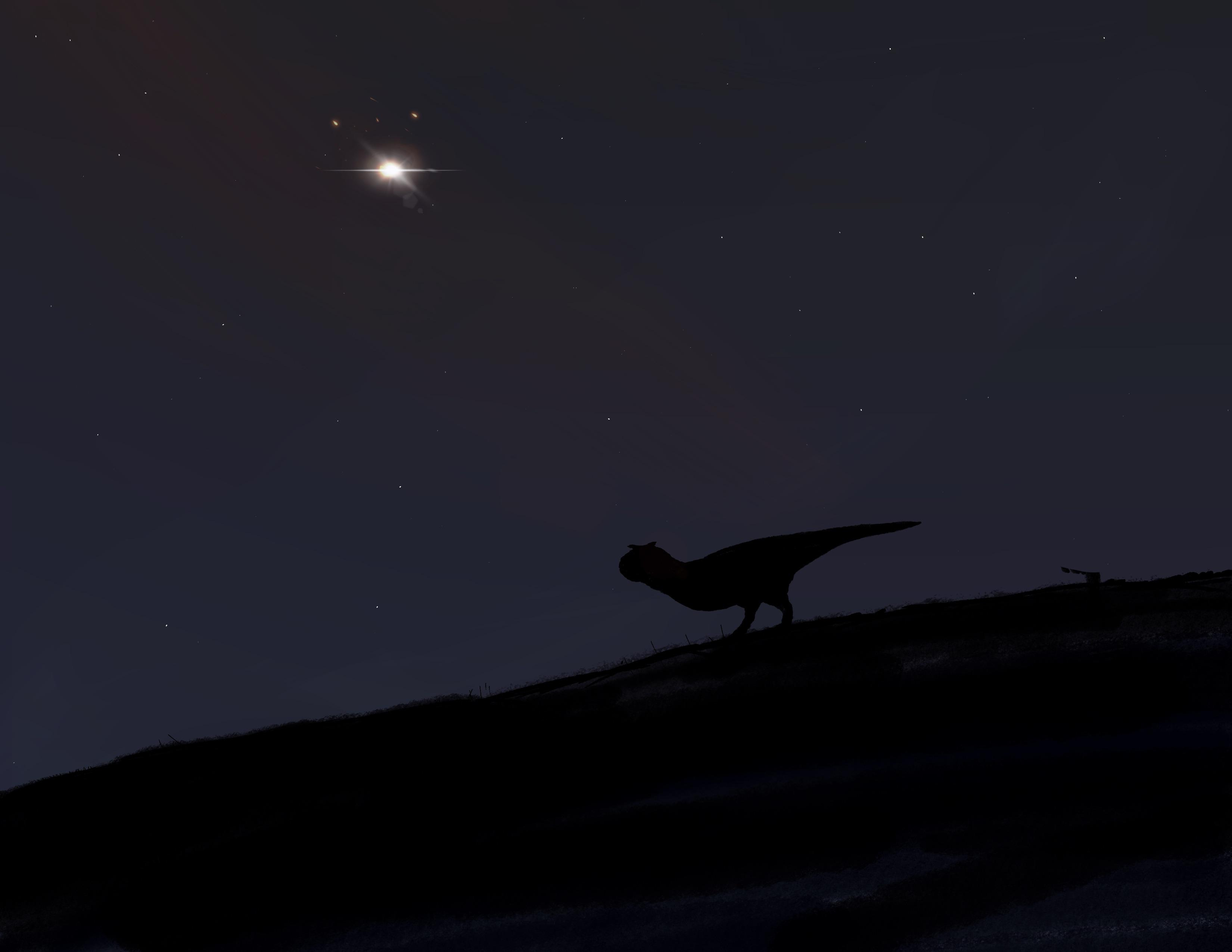 But tonight, he is alive, and walking down a hill near the edge of his territory. A cool breeze rustles across the fern prairie and tickles his nostrils. At the bottom of the hill he can hear an elasmarian digging for tubers, and from further away the breeze carries with it the rich scent of sleeping saltasaurs. He can find no sign that his territory has been intruded upon by other reavebulls. It is a perfect autumn night.