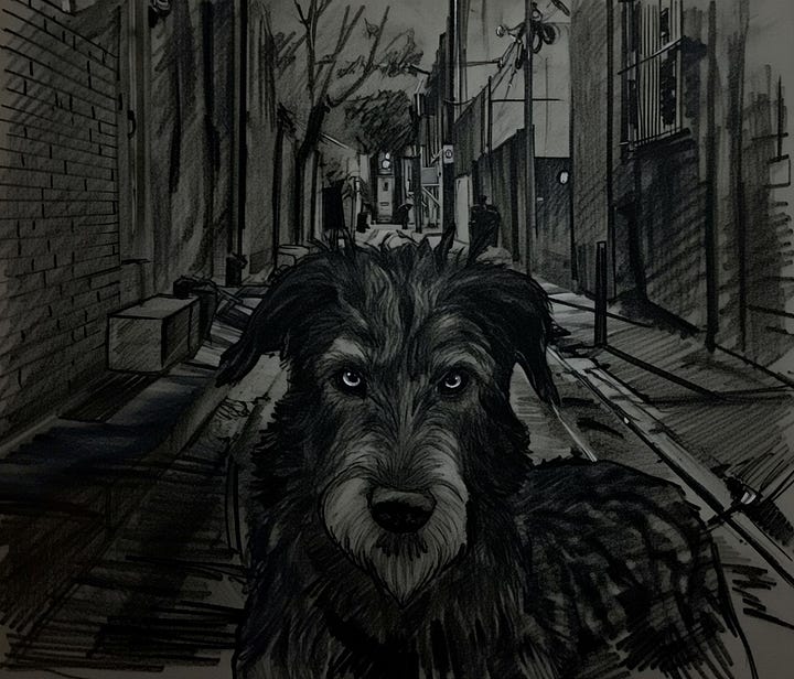 To help ground my descriptions of the creature, I actually made the Gytrash in Gimp, taking a stock photo of an Irish Wolfhound and giving it a wolf’s eyes. Also fiddled with the brightness and contrast to make the coat darker than the actual dog’s. The result was a pretty cool, eerie looking animal. I then took the dog out of the original photo background and fitted it over a stock image of a Philadelphia alley scene. Then, for the final touch, I fed the image into Grok and prompted it to transform the image into a “dark charcoal sketch.” I then layered this AI edited version on top of my original Gimp composition and turned down its opacity until the dog had this weird, half-illustrated half-photographed look to him.
