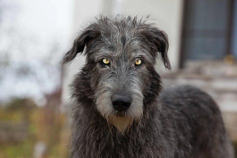 Also, the description of the Gytrash’s immense size was not any sort of exaggeration, to either the folkloric dog or the real wolfhound. Irish Wolfhounds really do get big enough for a mite of a girl like Denali to look one in the eye.